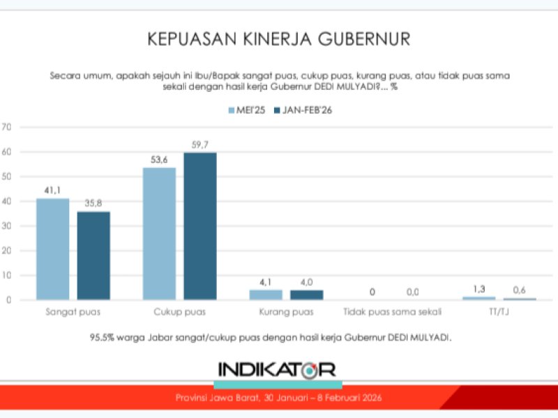 Jabaronline.com – Lembaga survei Indikator Politik Indonesia merilis hasil evaluasi kinerja Pemerintah Provinsi Jawa Barat periode Januari–Februari 2026. Hasilnya, kepuasan masyarakat di wilayah Kabupaten Bogor terhadap kinerja Gubernur Dedi Mulyadi (KDM) tercatat sangat tinggi, menyentuh angka 92,8%.